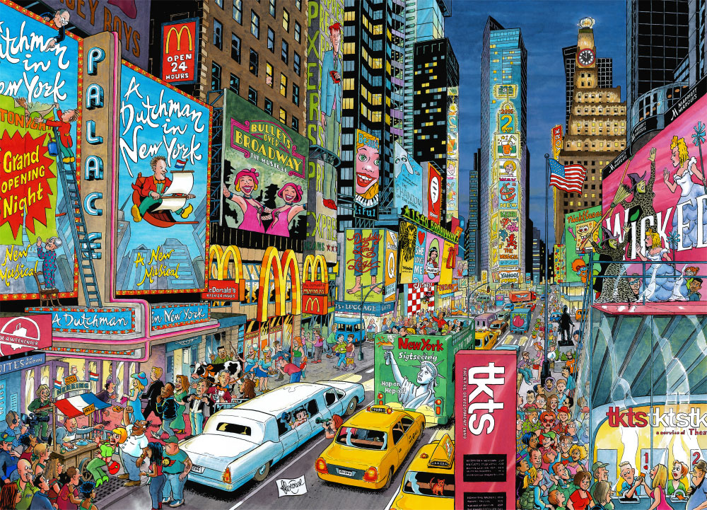Le Roux eventually broke out of Groningen's city boundaries, and began making similar drawings of other cities too. His most notable work in this genre has been the jigsaw puzzle line 'Cities of the World' for Ravensburger. Since 2014, London, Paris, New York, Rio de Janeiro, Vienna and Amsterdam are among the crowded cities that have been visited and captured by the artist's pen. Set against a recognizable and highly detailed background, Le Roux fills his crowded streets with funny events and his own interpretations of local events and festivals. With this new occupation, Frans Le Roux followed in the footsteps of Jan van Haasteren, another comic artist who made the grade with crowded, comical jigsaw puzzles. Other Dutch comic artists who have ventured into the profitable world of puzzle illustrations are Rob Derks, Mars Gremmen, Dick Heins, Wilma van den Bosch and Uco Egmond.