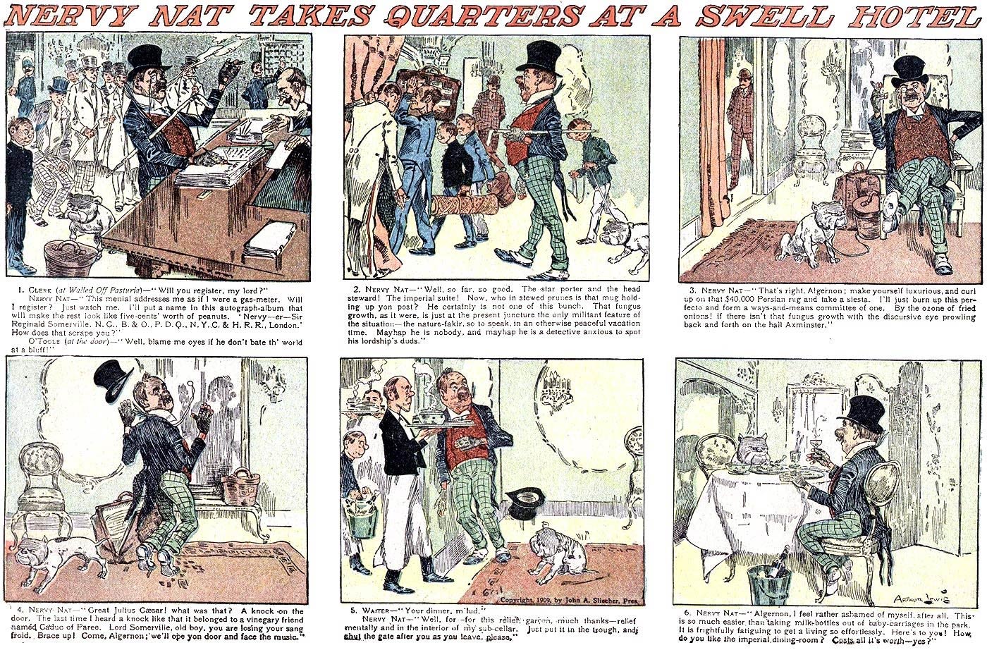 Starting in 1903, James Montgomery Flagg had success with the text comic 'Nervy Nat', published in Judge. It featured the shenanigans of a cunning tramp. In 1907, Flagg left to join another magazine, Life. Still, he made a comeback two years later. In 1909, Flagg occasionally drew episodes of 'Nervy Nat' at irregular intervals, when it ran in Judge as a syndicated Sunday newspaper comic until 5 September.