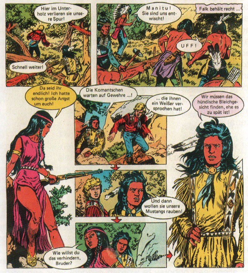 Frank Sels had a bumpy relationship with his German publisher. Bastei regularly meddled in his production by submitting mediocre scripts and remounting pages. To keep up with his weekly workload of 28 pages, Sels hired assistants to help out with the artwork. Since this resulted in differences in style and quality, Bastei intervened once again, demanding that Sels should draw his own pages. Sels had a dynamic drawing style that was difficult to mimic. Only Greet Liégeois managed to approach it. As a result, she drew five 1970s 'Silberpfeil' stories, without Bastei ever knowing it. For many years, there was a rumor among fans that an anonymous Spanish artist had helped Sels with his artwork. In Brabant Strip Magazine #143 (October 2006), Renaerts revealed that this was in fact his wife Greet.