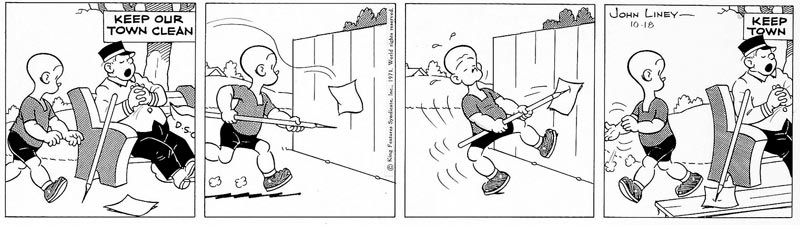 John Liney was Carl Anderson's assistant on the 'Henry' newspaper strip from 1936. Originally from Philadelphia, he was a cartoonist with the Philadelphia Evening Ledger, and he taught cartooning at Temple University during the 1940s. He was a gag writer for 'Henry' between 1936 and 1942, and was involved in teh penciling 1942. He took over the daily strip completely after Anderson became ill in 1942, and continued it on his own until 1979. The Sunday page was continued by Anderson's other assistant, Don Trachte. Liney was succeeded by Jack Tippit. Liney was also responsible for the art of the 'Henry' comic books published by Dell from the mid-1940s until the early 1960s.