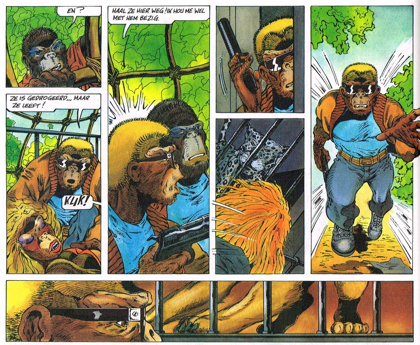 Linssen later drew the obscure comic book series 'Chroniques Gorilles' ('Gorillakronieken'). Scripted by Jean-Claude Smit-Le-Bénédicte (Mythic), the series was set in an anthropomorphic world where all characters are apes. Drawn in a realistic style, the stories are very action-packed. A rather surreal moment in the first story has the apes flee into the Antwerp Zoo, where nevertheless real non-anthropomorphic animals reside too. Two books were published by Éditions Himalaya (Loempia) in both French and Dutch language: 'La Loi des Séries' ('Apen in Antwerpen', 1990) and 'Les Ombres du Président' ('De Gorilla’s van de President', 1991).