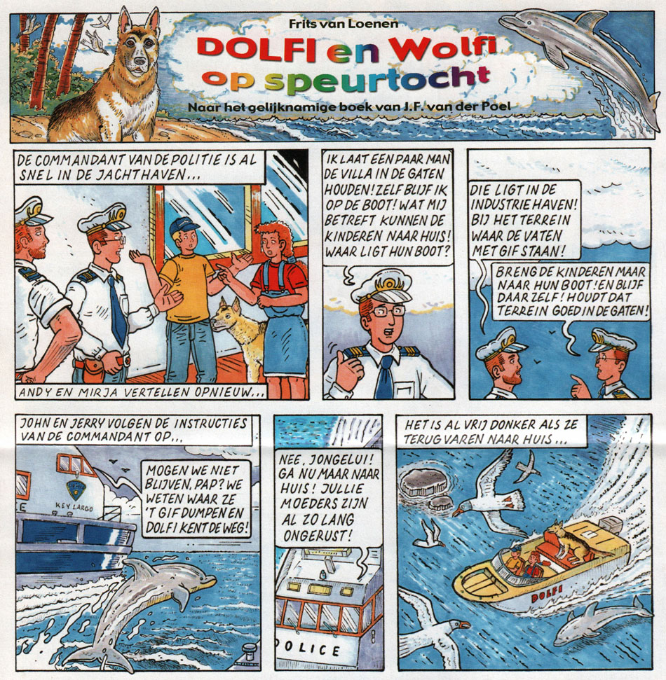 In 2003, Van Loenen began his collaboration with the Christian children's magazine BimBam, for which he created the comic serial 'Dolfi en Wolfi', based on the children's book series by J.F. van der Poel. The stories take place in Florida where two children have exciting adventures with their dolphin Dolfi and shepherd dog Wolfi. Between 2008 and 2012, four book collections were published by De Groot Goudriaan, an imprint of Uitgeverij Kok. Since 2017, Frits van Loenen has also supplied BimBam with a bi-weekly activity spread. A selection of these pictures were collected in the booklet 'Kijk Nou Eens!' (Den Hertog, 2020).