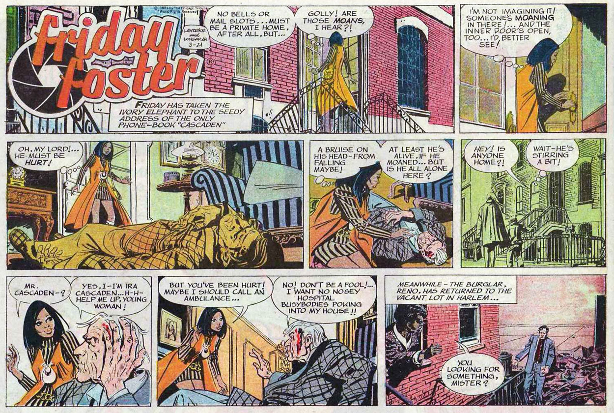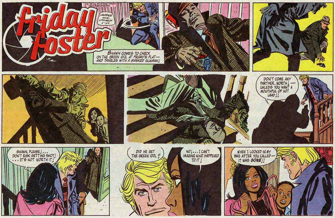 'Friday Foster' stars the adventures of African-American fashion photographer Friday Foster, who worked as an assistant to white photographer Shawn North. Friday worked her way up from a harsh youth in Harlem, New York City. The series follows her as she eventually became a fashion model herself, traveling all over the world and finding the man of her dreams. 'Friday Foster' was drawn in a realistic style, with Longaròn spending much detail in his backgrounds, particularly when Friday visited London, Paris, Hong Kong or Africa. The writing had a dramatic tone, making the comic strip comparable to a romantic soap opera. Interviewed by David Moreu on 17 January 2015 for the website museumofuncutfunk.com, Longarón only remembered one instance of censorship. In one episode Shawn Forth travels to Harlem, where a black teenage gang threatens him with a knife. The syndicate removed the weapon, which made many readers wonder what was going on in this scene? In the same interview the cartoonist remembered receiving praise from the director of the Metropolitan Museum of Art for depicting the museum in the series. And pop singer Tom Jones once requested him if he could buy an original panel, since he was given a cameo in one episode.