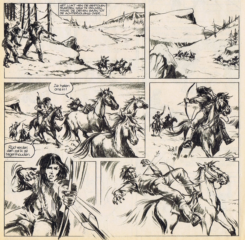 In Pep, Looman was regularly paired with the writer Anton Quintana (Anton Kuyten), of which he illustrated 36 text stories between 1971 and 1974. After a while, Pep's chief editor Hetty Hagebeuk asked Looman and Quintana to make the leap to comics, and create a historical serial about Mongolian leader Genghis Khan. According to an interview in Striprofiel #5 in 1974, Looman first spent two years doing try-outs, recreating the same two pages (79 and 80) over and over before finding the right style.