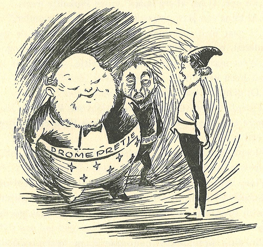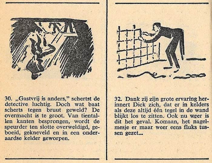 Van Looy's other excursion into the comics medium was 'Dick Parker: Het Geheim van de Roestige Spijker' (1951), a parody by novelist and columnist Godfried Bomans of the 'Dick Bos' picture novels by Alfred Mazure. Dick Bos was a hard-boiled police investigator who wasn't afraid to use his fists. The 'Dick Bos' dime novels were very popular with young readers, but moral guardians criticized the tales for being violent pulp, which discouraged the youth from reading "real" novels. In the late 1940s and all throughout the 1950s, the media storm against 'Dick Bos' and similar picture novels was huge, and gave comics a social stigma from which the medium barely recovered in the next decades. Yet Bomans had no problems with comics. After all, he had already scripted a newspaper comic for Het Parool, 'De Avonturen van Pa Pinkelman' (1945-1952), illustrated by Carol Voges. He found all the media frenzy and witch hunts preposterous, but it inspired him to spoof 'Dick Bos' and show moral guardians how overblown their criticism of picture novels and comics were.