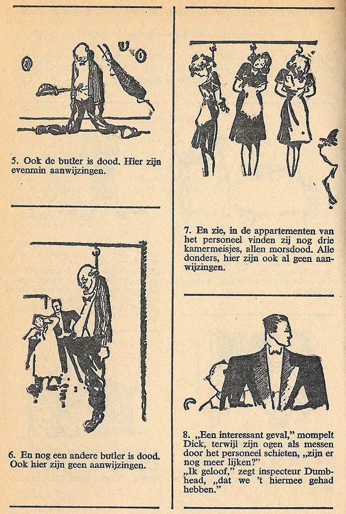 'Dick Parker' follows the "great detective Dick Parker" in an "educational and constructive picture story". The plot kicks off with Parker being asked to investigate "yet another murder mystery", which his colleagues can't solve, "because they are idiots". Throughout the story, Bomans occasionally refers to characters and situations from non-existing "previous episodes". The body count, action sequences and violence are depicted in the most ridiculous ways. Parker is apparently capable of jumping from a driving vehicle through the window of a moving train. Even during fights he is never severely wounded, despite getting hit with a pick ax. While the tone is humorous, Van Looy depicts the violence in a far more gruesome way than the original 'Dick Bos' stories. We see bleeding corpses and in one particularly chilling scene a man is split in two, revealing his skeleton and intestines. The comic strip was serialized in Elsevier magazine and later collected in Bomans' book 'Capriolen' (1953). However, it was omitted from later reprints, when 'Dick Bos' had lost much of its topicality. A strange decision, since the story is perfectly enjoyable even if one is unfamiliar with the original spoof target.