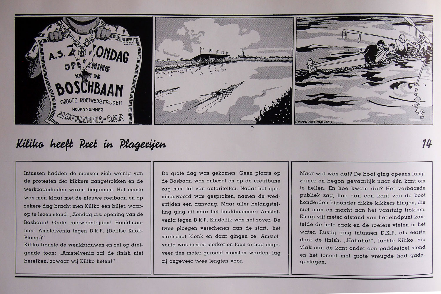 On a couple of occasions in his career, Van Looy tried his hand at comics. In 1942, he was present in the children's magazine Doe Mee!, published by N.V. Uitgevers Maatschappij De Jeugd, succeeding Hans Kaales as the artist of the Karl May comic serial 'Winnetou, Het Opperhoofd der Apachen', scripted by A. Ekker. An rare later comic by Van Looy is a 32-pages give-away comics book of 32 x 22 cm, that came with the Amstelveen weekly De Boschrand. It is undated, but presumably from the 1950s. Highly obscure and very local, 'Leven en Lotgevallen van Z.M. Koning Kiliko - De Koning der Kikkers' stars a frog king who protests against the construction of a landscape park, which will cause the disappearance of ditches and meadows. This obviously refers to the construction of the Amsterdam Forest in Amstelveen and Amsterdam, built between 1930 and 1970. The opening strip directly refers to the boat races on the park's new Bosbaan waterway. Considering the use of old Dutch spelling in the artwork, the original story might be from 1937, the year the rowing course was inaugurated. The book is however of a later date, since the captions make use of modern post-1947 spelling.
