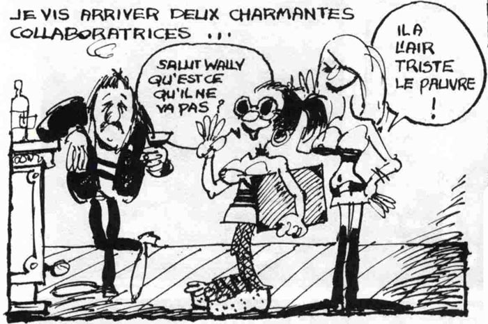 Artwork by Wally van Looy additionally appeared in the magazines Tarzan, De Fluwelen Kater and Mornix. His artwork also appeared in mainstream magazines. In 1973, he created four news-of-the-day related pages for the Belgian edition of Pilote (issues #692, #733, #734 and #737). He was also present in Tintin and its Dutch-language edition Kuifje with the gag strip 'Croqueminou'/'Snoby' (1974-1975), about a Tarzan-like man living in the "mysterious jungle" with a cultivated creature called the Croqueminou. The feature was created in collaboration with Michel Noirret.
