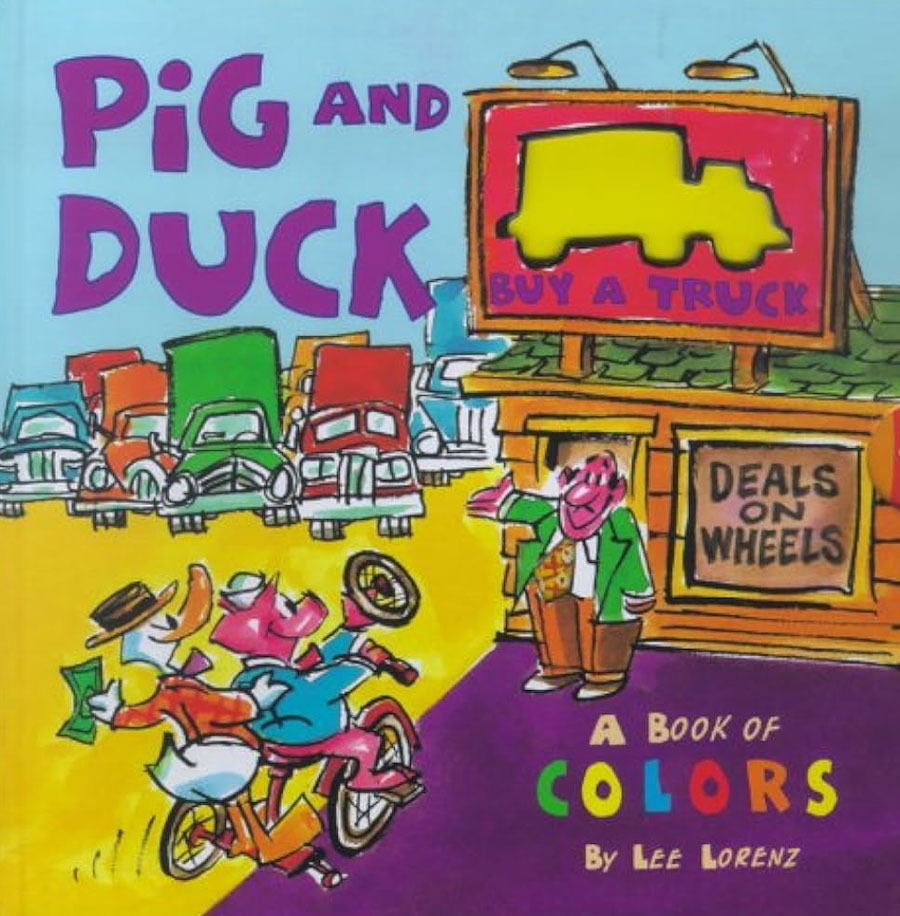 Lorenz additionally wrote and illustrated several books of his own. Two were based on Geoffrey Chaucer's classic narrative poem 'The Canterbury Tales', namely 'Scornful Simkin: Adapted from Chaucer's The Reeve's Tale' (Prentice Hall, 1980) and 'Pinchpenny John: Suggested by Incidents in Chaucer's The Miller's Tale' (Prentice Hall, 1981). Among his original children's books were the titles 'Big Gus and Little Gus' (Prentice Hall, 1982), 'The Feathered Ogre' (Prentice Hall, 1983), 'Hugo and the Space Dog' (Prentice Hall, 1983), 'A Weekend in the Country' (Prentice Hall, 1985), 'Dinah's Egg' (Simon and Schuster for Young Readers, 1990), 'A Weekend in the City' (Pippin Press, 1991) and 'Pig and Duck Buy A Truck: A Book of Colors' (Little Simon, August 2000). 'The Feathered Ogre' has also been translated in French as 'L'Ogre à Plumes'.