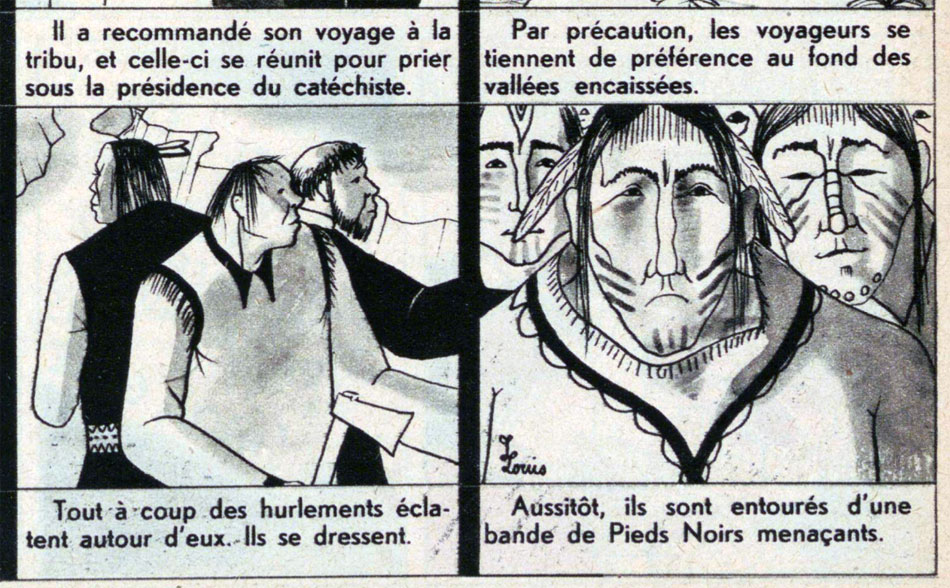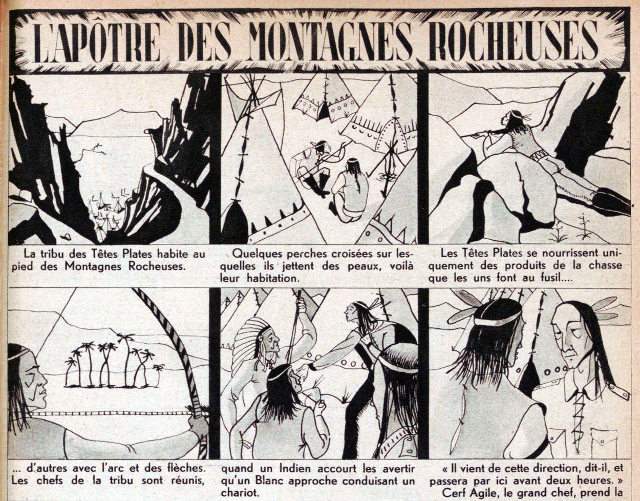 In the first issue of Grand Coeur of 20 December 1945, Jo Louis's text comic serial 'L'Apôtre des Montagnes Rocheuses' kicked off, continuing until 13 June 1946. The tale starts with a ploy of the "Flathead" Native Americans to massacre their neighbors, the Blackfeet, after feeding them "fire water" (whiskey). In true edifying spirit, the local Catholic priests, the "Black Robes", send the missionary Father De Smet to the Native Americans to introduce the natives to the true belief in the "Great Spirit".
