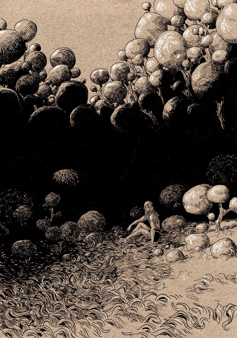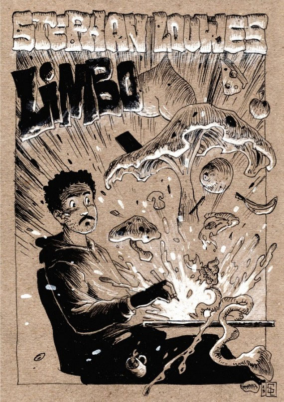 Louwes' graduation project was the graphic novel 'LIMBO - Lux in Tenebris?', subsequently published in book format by Oogachtend. A wordless graphic novel, each page is a full panel that tells the story of a boy who sees his friends disappear in the darkness one by one, leaving him wondering whether he'd risk his life to save them. To add to the overall mysterious atmosphere, both the cover and the interior of the book are printed on a thick type of kraft paper, while the author only used black ink and white paint. The first 2019 book release was followed by two more 'LIMBO' installments, subsequently 'Vox Aquarum' (2021) and 'Legatum' (2023).