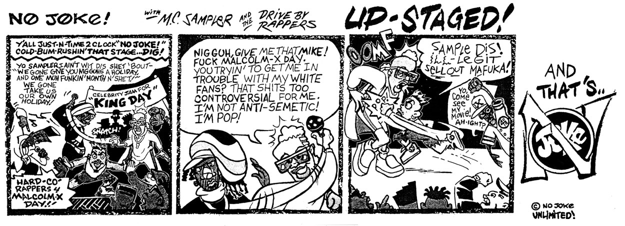Episode of Jerry Brice's hip hop strip 'No Joke!' by Brice and Overton Loyd on the occasion of Malcolm X Day Black History Month in the early 1990s.