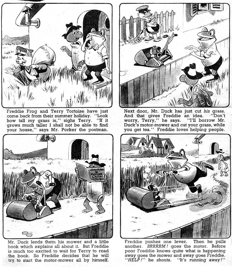 A far more durable collaboration took off around the same time when Lupatelli started working for the British publisher Fleetway, most likely also through D'Ami. Fleetway published various children's magazines, including Playhour and Jack and Jill.Lupatelli was one of several artists who created illustrations and text comics about children, cute animals and fairy tale characters for these publications, including Sergio Asteriti, Jim Turnbull, Peter Woolcock and Gordon Hutchings. Asteriti worked as Lupatelli's assistant. Two of the comic series he worked on were 'The Funny Tales of Freddie Frog', starring a character originally created by Peter Woolcock, and 'Fun in Toyland'. He contributed to the magazines' annual books, for which he most notably drew 'Little Sooty', a boy who is half human, half scooter, from scripts by D'Ami. In 1961 Lupatelli also illustrated 'Moony of the Moon' for the Harold Hare annuals, which told the adventures of an extraterrestrial Moon creature who now tried to live on Earth among his human friends. The feature was later drawn by British artist John Donnely.