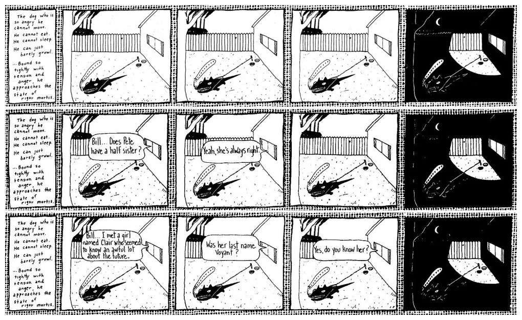 Despite the title, the dog isn't really the focus. The conversations in the house draw all our attention and they never even mention the animal. Instead, we read philosophical observations, lame jokes, fierce arguments or awkward attempts at small talk. None provide the reader with a straightforward answer of what is going on in and outside the house. Four people seemingly live inside: Bill, Sylvia, Pete and Billy, but the reader has no clue how, or if, they are related. There's never an indication who's talking, let alone whether we are reading a dialogue or a monologue. For all we know, it could be a delusional person talking to himself. Or perhaps there's nobody in the building at all, opening up new questions where the voice(s) might be coming from. Overall, 'The Angriest Dog in the World' has a voyeuristic feel, as if the reader is observing some mysterious neighbors across the street, who seemingly never leave their home. The repetitive imagery gives everything a hypnotic, eerie, uncomfortable atmosphere.