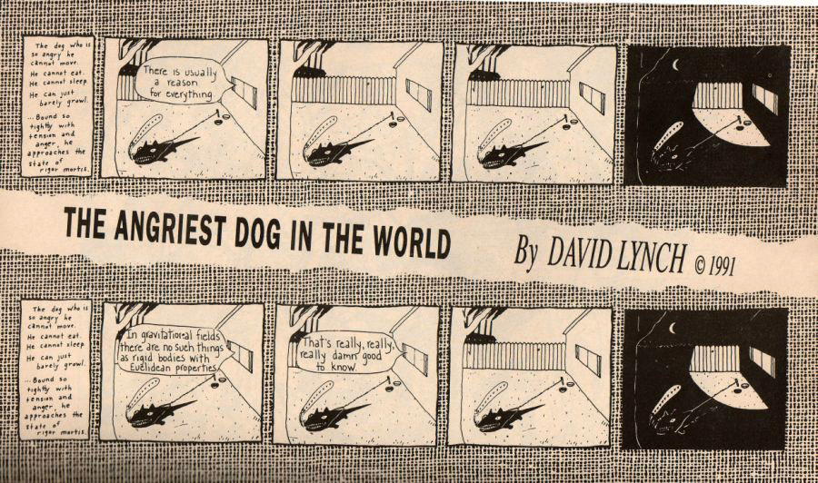 Besides Transcendental Meditation, Lynch also let off steam by drawing a comic strip about the self-described "angriest dog in the world." Interviewed by David Breskin in the book 'Inner Views', Lynch revealed that, when he conceived his comic, he was very angry about and at many people and things, but thanks to meditation able to make these feelings disappear, without ever knowing "where my anger came from [or] (…) where it went, either." A decade later, in 1983, Lynch approached James Vowell of The Los Angeles Reader with the intention to make a weekly comic for his publication. When Vowell asked what it was about, Lynch replied: "Well, it's kind of a weird concept. There's only like one… part." Nevertheless, Vowell still had it serialized and, due to Lynch's fame, other alternative weeklies picked it up it too, including Atlanta's Creative Loafing, the New York Press and Denver's Westword. Titled 'The Angriest Dog in the World', Lynch's comic revolves around a vicious black dog, chained to a pole in someone's backyard. In each episode, the same introduction can be read in the first panel: "The dog who is so angry he cannot move. He cannot eat. He cannot sleep. He can just barely growl. Bound so tight that he approaches the state of rigor mortis." Indeed, the mutt appears to be literally stuck in the same pose, forever barking one word: "Grrrrrrrr". All four drawn panels are the same identical image, only with three of them taking place during daytime and the fourth one at night. The only different element in each episode are the speech balloons coming from within the house.