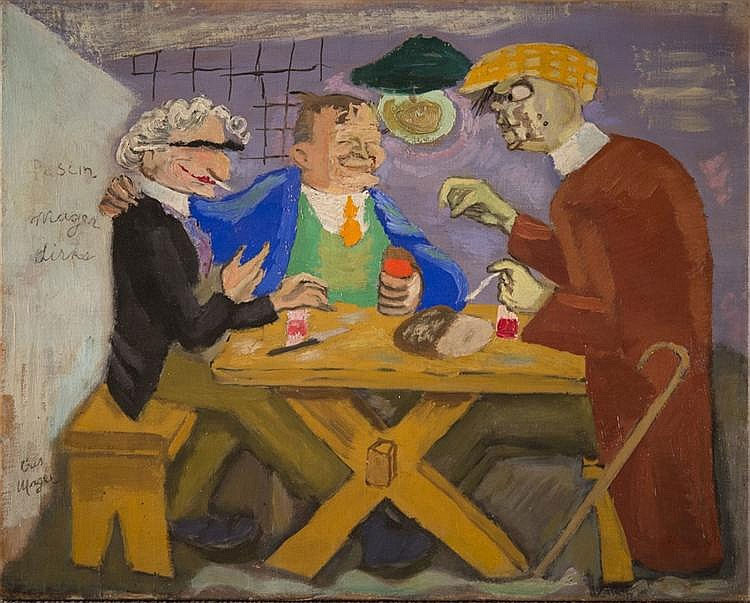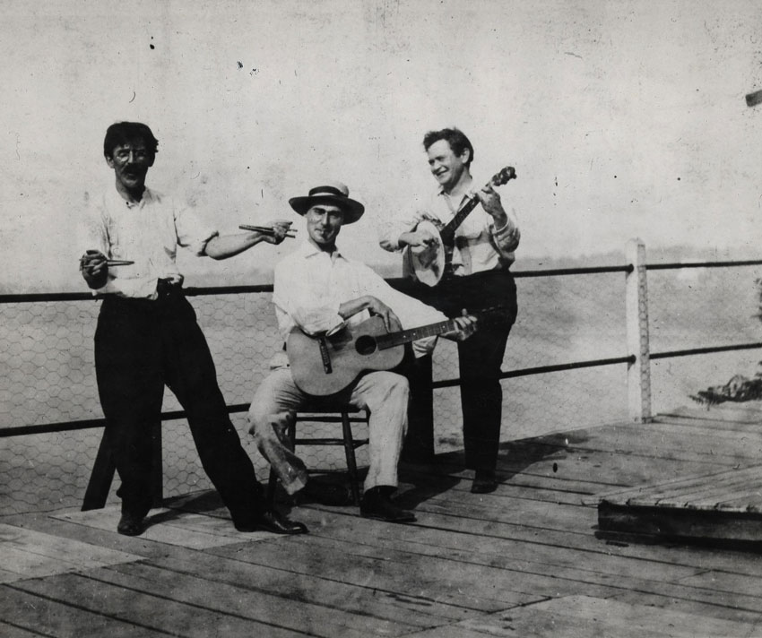 Gus Mager (with banjo on the right) with cartoonist friends Pop Hart and Walt Kuhn (approx. 1915).