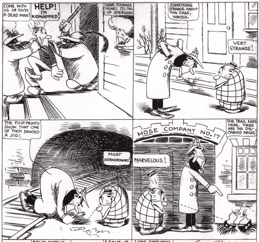 However, Gus Mager borrowed a bit too much from Arthur Conan Doyle's original. He didn't just spoof the characters, but also plagiarized entire plot elements from 'Sherlock Holmes' stories, including the assassination attempt from 'The Adventures of the Empty House' (1903). Doyle was not charmed and threatened to sue. And so, in 1913, Mager rebooted and retitled his feature as 'Hawkshaw the Detective'.