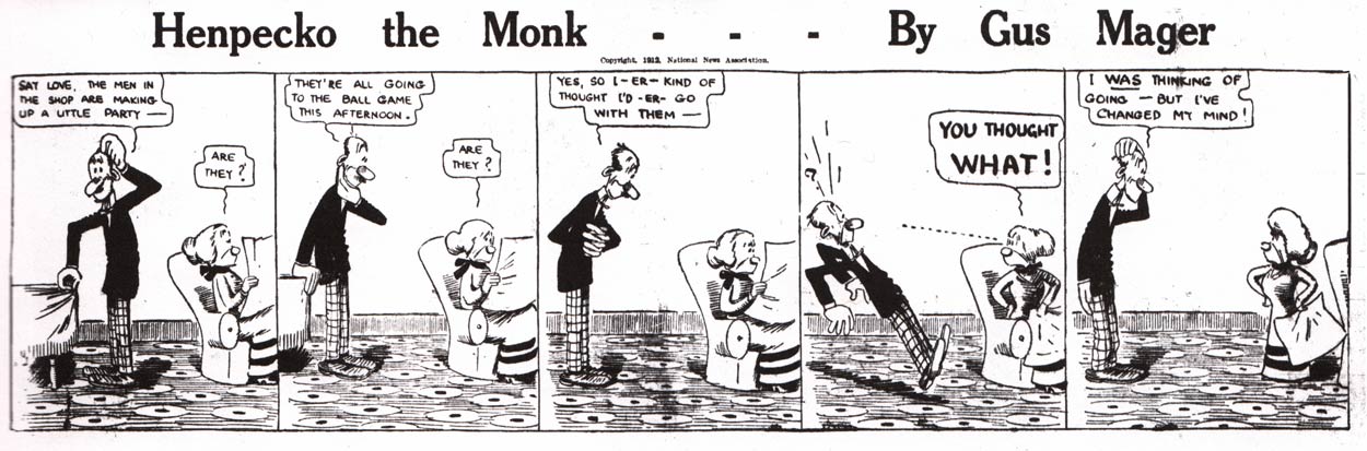 On 22 April 1904, Mager started a long-running series of characters nicknamed "The Monk" (1904-1913) and whose first names ended with an "-o". Contrary to what one might assume from the title, they weren't monks, but monkeys. First in line was 'Knocko the Monk', soon followed by a whole group of monkeys all defined by one personality trait. Knocko was posh, Groucho grumpy and Braggo arrogant. Grafto was opportunistic, Tightwaddo stingy, Henpecko submissive and Coldfeeto anxious. Nervo was brazen, Boneheado stupid and Forgetto absent-minded. Joko loved playing pranks, Hamfato couldn't act and Rhymo always spoke in rhyme. Relying on the possible creative ideas each personality trait might offer, some of these character-driven gag comics only ran for a couple of days.