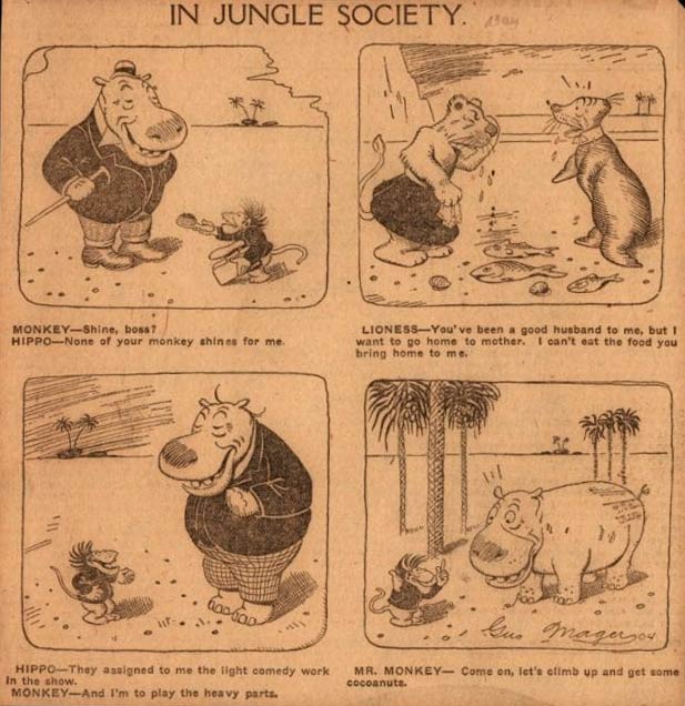 In April 1904, Mager became a cartoonist for The New York American and the New York Evening Journal, newspapers owned by William Randolph Hearst. Mager's early drawings were one-panel gag-a-day cartoons featuring charming anthropomorphic versions of monkeys and hippopotamuses. These eventually evolved into comic strips under the title '(In) Jungle Land' (1904-1906), and sometimes as '(In) Jungle Society'. Early installments still had text captions, but the characters quickly used word balloons. Mager's strip was not related to later features with a similar title, such as 'In Jungleland' by Leo O'Mealia for the Associated Newspapers (1915-1915) and 'In Jungle Land' (1927-1928) by Whitey for the Paramount Newspaper Feature Service.