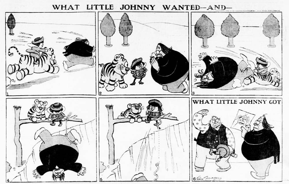 Many of these Mager creations were based on one gimmick that quickly grew stale. One of the shorter entries in his body of work was for instance 'Ain't I?'. Launched on 2 March 1909, it featured a character in a series of mishaps, asking the reader if they didn't consider this too much trouble for one person. By 10 March, Mager had already discontinued it. In his Sunday comic 'And Then Papa Came' (1904), a girl's suitor hides when her father comes, and chaos ensues when "poppa" comically discovers the suitor. 'Louie and Franz' (1904-1905) were a pair of nosy German-accented bears, and an early example of his interest in animal characters.