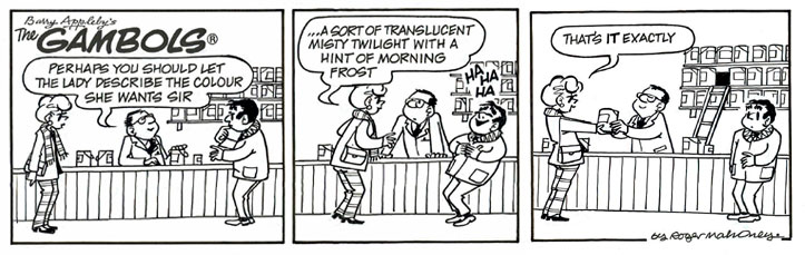 Roger Mahoney is a British cartoonist, who has worked on a great many newspaper strips. Born in Portsmouth, Hampshire, he studied at this town's Southern College of Art between 1947 and 1951. He initially worked as a professional musician, and started cartooning on the side for the Daily Sketch and the Daily Mirror. He made his first strip 'Mopsy' for the weekly Fleetway magazine Princess, and has since worked extensively for newspapers like the Scottish Daily Record ('Agony Is' and 'Sammy the Caterpillar'), Woman's Realm ('Mum'), Daily Mirror ('Millie', 'The Greens', and 'Andy Capp'), Sunday Express ('L') and the Daily Star ('What's in a Name?' and 'Last of the Summer Wine').