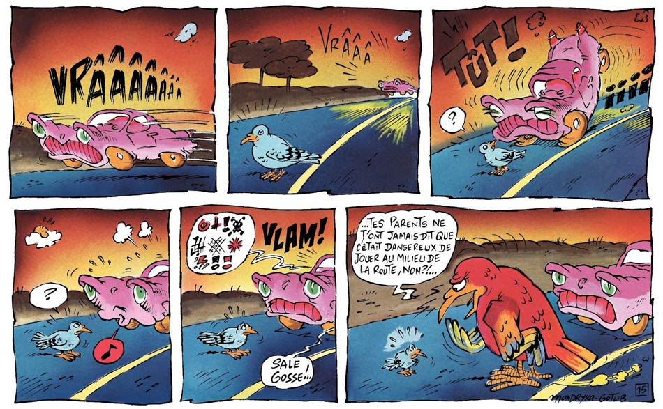 'Les Clopinettes', by Mandryka and Gotlib. An adult bird, who just carelessly ran over a human child, now stops to tell a little bird: "Didn't your parents ever tell you that it's dangerous to play in the middle of the road?"