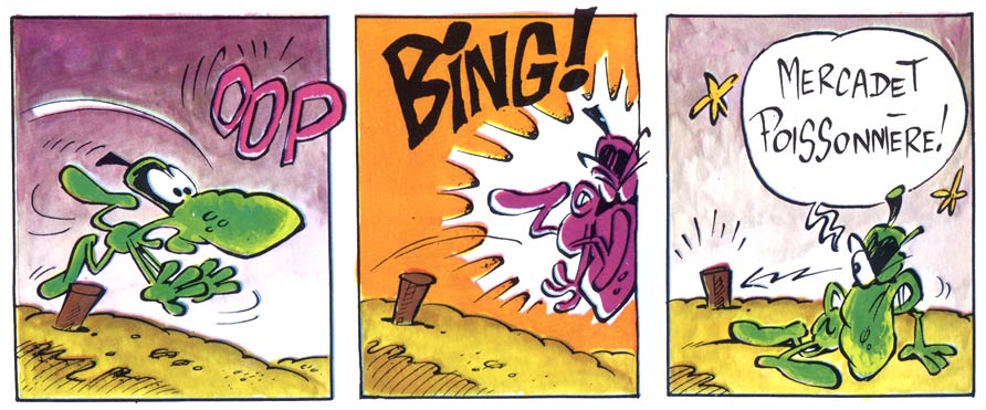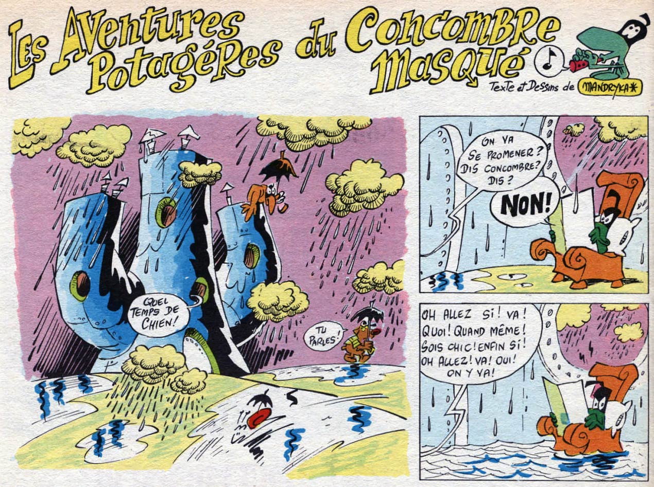 With Vaillant transformed into Pif Gadget in 1969, Mandryka realized the magazine was no longer suitable for him. Pif Gadget's younger readership didn't understand the weird and absurd humor Mandryka used in his Concombre strips, nor his latest feature, 'Ailleurs' (1969). He found a new home in the comic magazine Pilote, where the editors René Goscinny and Jean-Michel Charlier gave their artists more creative freedom and higher page rates. In previous years, Mandryka had already worked for the magazine, writing the scripts for the occasional 'Jonhatan Jonh' (1965-1967) feature, drawn by Ramón Monzón. Working more regularly for the magazine from 1969 on, Mandryka scripted one-shot comic stories for artists like Reiser, Yves Got and Jacques Lob, as well as episodes of Pilote's "current affairs" strips section. From scripts by Gotlib, Mandryka drew 'Les Clopinettes' (1970-1973), a series of nonsensical stories with weird morals and puns. In 1971, 'Le Concombre Masqué' also found its way to the pages of Pilote.