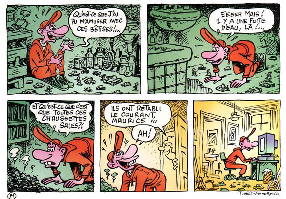 Between 1989 and 1995, Nikita Mandryka made regular appearances in Spirou magazine. He not only made new episodes of 'Le Concombre Masqué', but also illustrated an editorial column about animal species, written by Fritax (Jean-Claude De la Royère). The episodes were later compiled in the book 'Les Animaux Sont-Ils Des Bêtes' (P&T Production, 1995). In 1993, Mandryka was also presented in the children's weekly Perlin by Fleurus Presse, making the comic series 'Antoine, Camille et Bismuth' with scriptwriter Geneviève Panloup. Between 1997 and 2005, Mandryka additionally helped the Italian artist and writer Massimiliano Frezzato with the scripts and translation of his sci-fi series 'Les Gardiens du Maser' ('I Custodi del Maser'), published in French by Editions USA. In 2003, Mandryka returned to Spirou, working with fellow cartoonist Jean-Michel Thiriet on 'Cybertimes' (2003-2004), a series of gags about computers, video games and Internet.