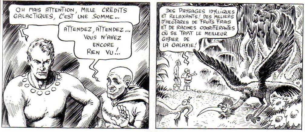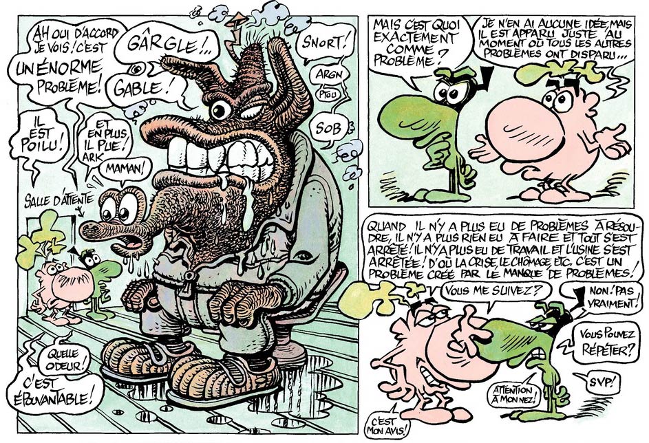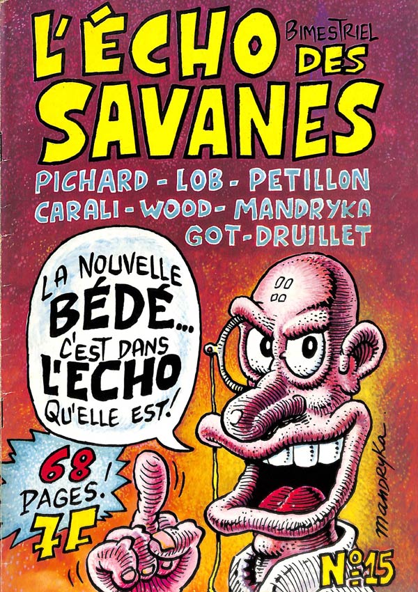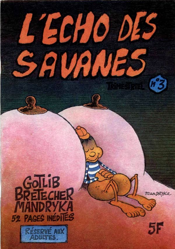 However, running a magazine was less easy than it sounded. After ten issues, the magazine still didn't make any money. Near the end of 1974, the original team broke up. Claire Brétécher became a staple in the leftist press, and Gotlib moved on to launch his own magazine, Fluide Glacial. Not wanting to lose his investment, Mandryka continued L'Écho des Savanes in the role of editor-in-chief. The trimestrial magazine became a bi-monthly publication, and new artists, writers and editors were brought in. Among the new contributors were Ted Benoit, Carali, Philippe Druillet, Jean Giraud, Yves Got, Jacques Lob, René Pétillon, Martin Veyron and Philippe Vuillemin. The magazine also ran translated stories from U.S. underground comix and material from Mad Magazine under Harvey Kurtzman's editorship. Thanks to this reboot, L'Écho des Savanes managed to keep on going. Mandryka left in 1979, selling his rights for a symbolic franc. He disliked the new direction "his" magazine was taking, with the inclusion of pornographic comics for commercial purposes. In 1995, Mandryka had a brief comeback in L'Écho with the one-shot science fiction story 'Les Aventures Galactiques de Roger Bacon', which was later published in book format as 'Y'A Plus de Limites' (Albin Michel, 1996).