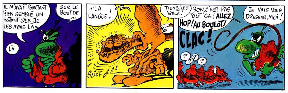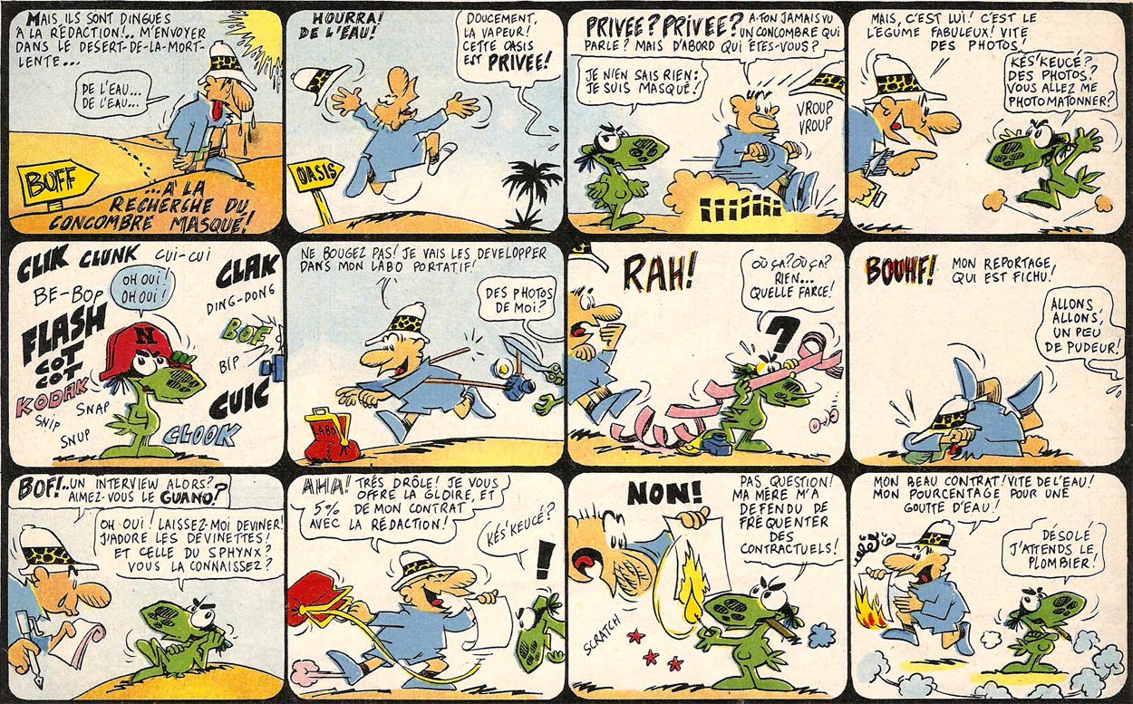 Nikita Mandryka's most enduring and original creation for Vaillant/Pif however was his masked cucumber, originating from the 'Boff' strip but appearing in solo gags from issue #1038 (4 April 1965) on. The inspiration came from a strange comic strip in Vaillant, which Mandryka read as a child: 'Le Copyright' (1952-1953) by Jean-Claude Forest. The Copyright was a strange, big-nosed desert animal who was chased by people who never managed to catch him. Despite its short run, 'Le Copyright' made a huge impression on Mandryka. In his sketchbooks, he started drawing his own fanfiction.