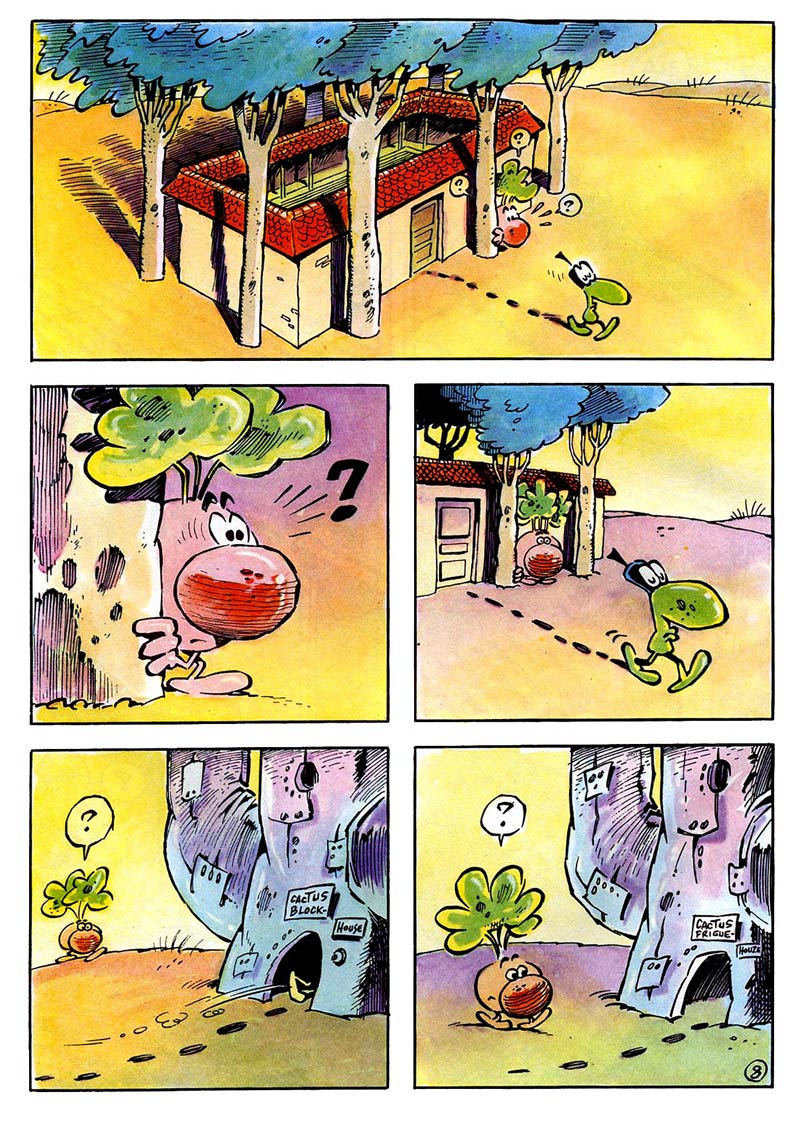 The adventures of Le Concombre Masqué are set in a strange desert at the world's end. This desert is inspired both by George Herriman's 'Krazy Kat' and also Mandryka's own North African childhood. The cucumber is described as "the last member of a species that once ruled the world", before "cucumbers were decimated by conquistadores and enslaved by grocers." His catchphrases are "Vazyléon" ("Vas-y, Léon!", meaning "C'mon, Léon!") and "Tout finit en purée!" ("Everything ends in mashed potatoes!"). The Concombre's personality is not clearly defined. He can be arrogant, bewildered, intelligent or just plain stupid. His sidekick is Chourave, a sprout. In some episodes Concombre's grandmother acts as the voice of reason. Next to the Concombre's house cactus live a group of elephants, who like to bowl or play cards. In true comic book fashion, the masked hero also has an arch villain: the mad scientist Le Grande Patatoseur, who is accompanied by his assistant Fourbi. As his name implies, the Patatoseur owns a special ray gun that can transform things into potatoes (and nothing else). All other characters in the series are anthropomorphic animals, plants or objects. Even the Sun is a recurring character; in several stories he is too sleepy to get up in the morning.