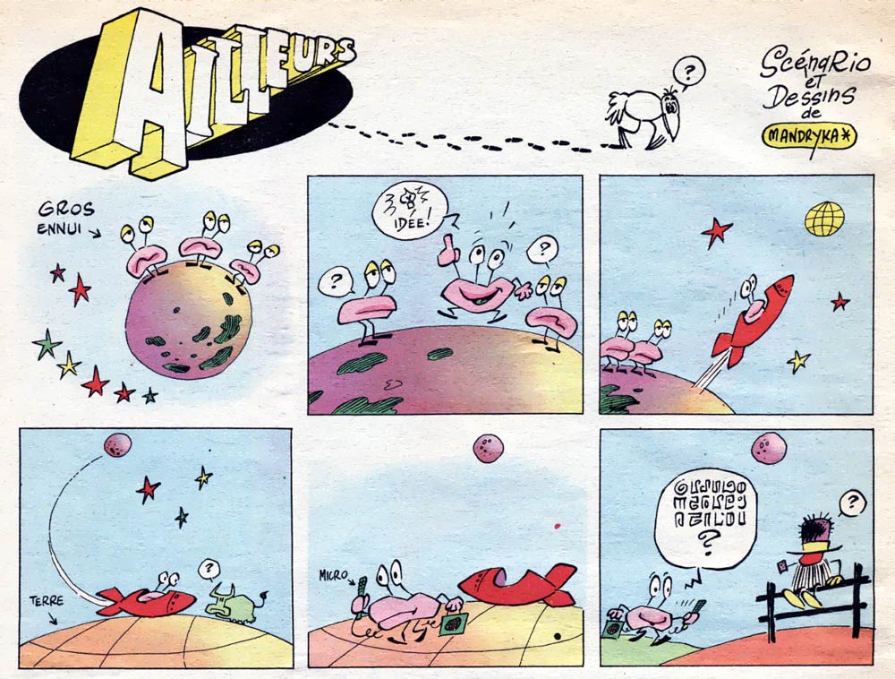 Between 1965 and 1969, Mandryka used the pseudonym Kalkus: a name derived from the owner of a Montparnasse atelier where one of his painter friends worked. The cartoonist also used variations of this pen name, such as Kalkus, Calgus, Karl Kruss, Caleq-usse, Kudsak and Kilkoz. By the time the Vaillant title was changed to Pif Gadget (24 February 1969), Mandryka began using his real name for his comic work. Around this time, Mandryka also launched his final new creation in the magazine: the absurd pantomime gag strip 'Ailleurs' (1969). In 1973, a couple of additional gags appeared in the comic news magazine Phénix.