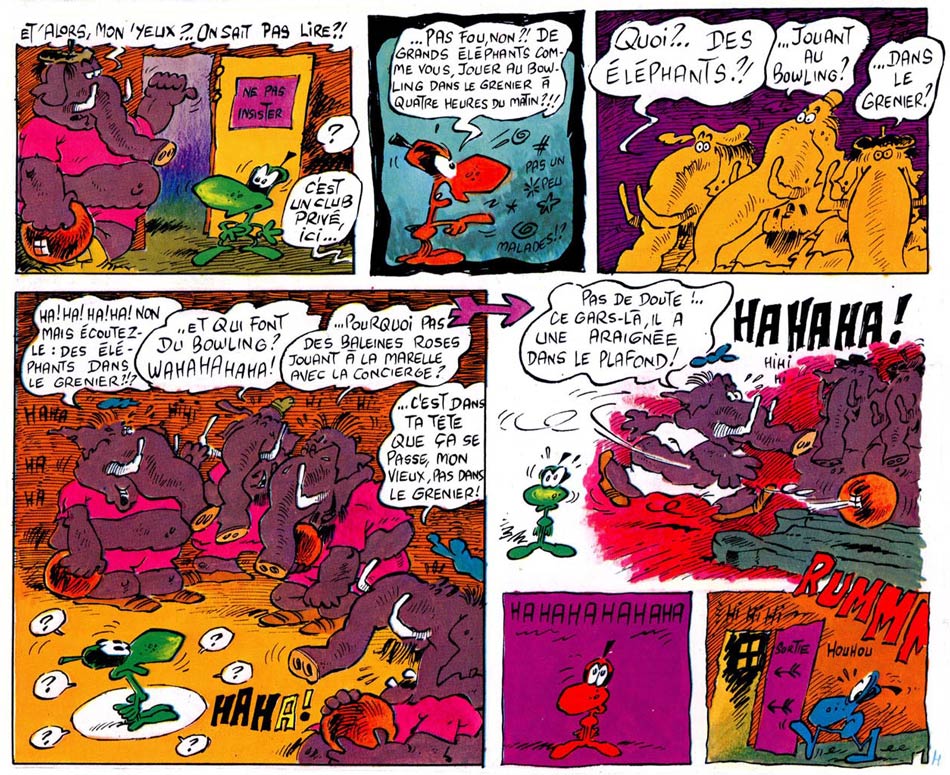 Overall, 'Le Concombre Masqué' is very surreal. In many cases, the situations have metaphorical meanings or visualize proverbs and sayings. In one episode, the Concombre's brain is seen taking a shower, literally "brainwashing itself." In another gag, the vegetable is awoken by the sound of a dripping faucet. He decides to chase the water tap, because he hates "the sound of a running water tap." Mandryka enjoyed playing with language, making his comics difficult to translate. In one episode, there is a spider on the ceiling: a nod to the French proverb "avoir une araignée dans le plafond", a synonym for craziness. Adding to the translation problem are Mandryka's deliberately misspelled or altered words and expressions. Instead of the correct "Qu'est-ce que c'est?" ("What is that?"), every character spells it phonetically as "Keskeucé?". Mandryka's onomatopoeia are eccentric too: as a sound effect, the cartoonist often used simply the letter "G".