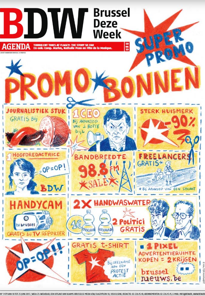 Cover cartoon criticizing the discharge of editor-in-chief Anne Brumagne (BDW, 18 June 2015).
