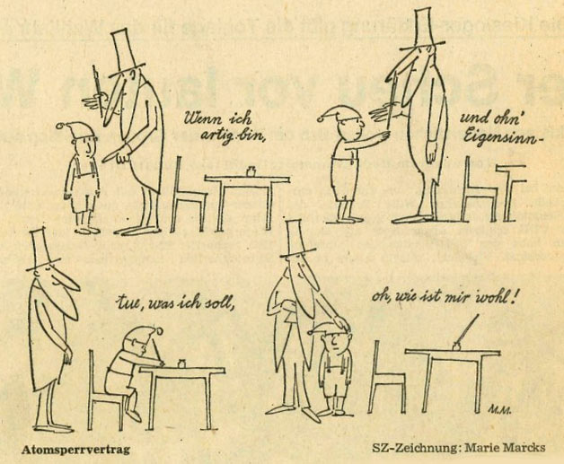 Marcks grew up in Berlin in an artistic environment, and received her first lessons from her mother, book illustrator Else Marcks-Penzig. She studied Architecture in Berlin and Stuttgart during the war, and began her career as a commercial artist and poster designer in post-war Heibelberg. She eventually turned to cartooning in the 1950s. Marcks worked as a political cartoonist for the Süddeutsche Zeitung for twenty years, and also published her work in Die ZEIT, Der Spiegel, Stern and Vorwärts. She also made illustrations for (children's) books. Her artistic legacy is preserved by the Wilhelm Busch Cartoon Museum in Hannover, where a retrospective exposition was opened in 2015.