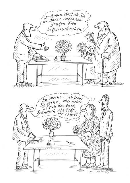 Cartoon by Marie Marcks. Translation: "And now, may I congrulate you with your young wife. I mean, I would love to marry the two of you, but have you carefully considered it, Mrs. Meier?".