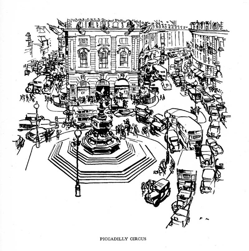 Drawing by William Francis Marshall of Piccadilly Circus, lifted from 'An Englishman in New York'.
