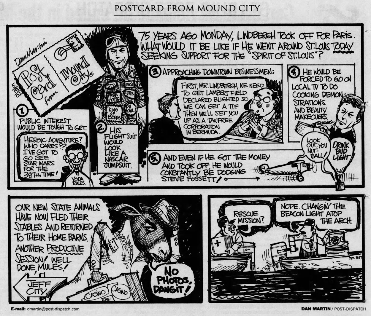 In 1996, Martin expanded his cartooning activities by starting his long-running cartoon/comic feature 'Postcard From Mound City' (1996-2023). Appearing on the "op-ed page" ("opposite the editorial page"), the 'Postcard' started on 25 December 1996 as a fill-in when one of the columnists was on holiday. Well-received, it was quickly picked up as a regular feature, appearing on Saturdays. The weekly strip takes a satirical look at the newsmakers in the city, as well as the daily issues facing the St. Louis people. Over the course of 26 years, Martin caricatured several famous, infamous and otherwise colorful people of the city, while giving commentary on local issues and daily frustrations. The ultimate insider's peek at St. Louis life, the strip has once been described as the "inside joke that only a St. Louisan could get". Even the "Mound City" in the title refers to a largely unknown and old-fashioned nickname for St. Louis, based on the nearby Cahokia Mounds.
