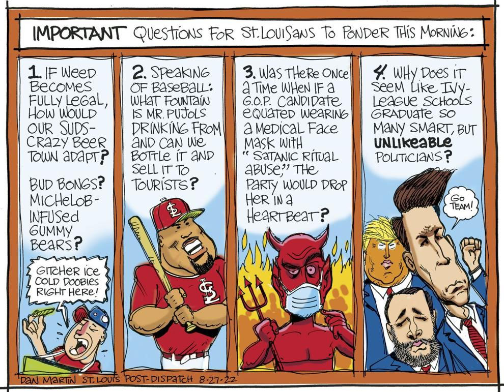 'Postcard from Mound City' (27 August 2022), featuring baseball player Albert Pujols and U.S. politicians Donald Trump, Ted Cruz and Tom Cotton.