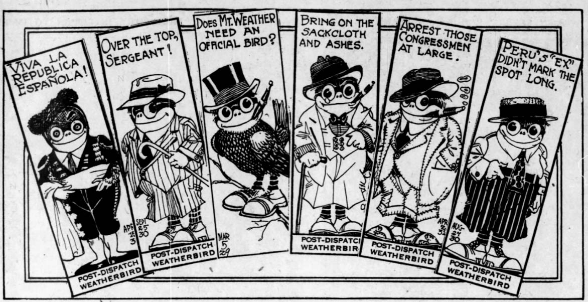 In 1910, Martin started drawing the 'Weatherbird', which lightened up the paper's daily weather reports. S. Carlisle Martin was the artist who turned the character into an actual cartoon star. While the bird originally just illustrated the forecast, Martin and editor Carlos Hurd let the bird comment on the news of the day. This was done in the so-called "birdline", which has a standard of six words and is still applied to this day.