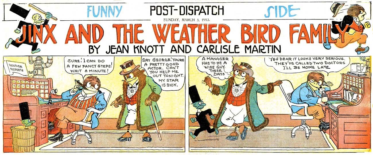 For several months starting in March 1912, the Weatherbird had its own Sunday comic strip, drawn by S. Carlisle Martin and originally written by Jean Knott. It replaced one page of the Funny Side comics section, produced by Pulitzer's other paper, the New York World. The bird universe was expanded to an entire family, and an imp called Jinx was added to the cast to stir up trouble. The strip was strongly inspired by Harold Knerr's 'The Katzenjammer Kids' and ran until 29 December 1912. C. Martin produced the page on his own during its final months. By then, Jinx had disappeared and the title had become 'The Weather Bird Family'. S. Carlisle Martin drew the cartoon series until his death in 1932.