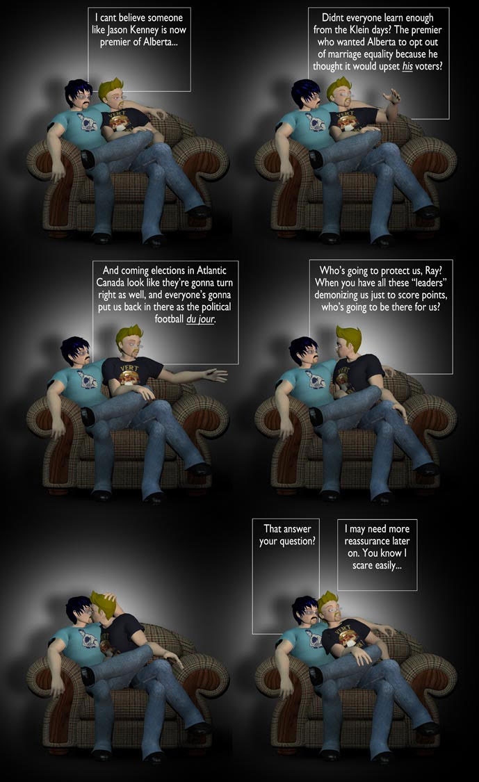 'Doc and Raider' 's original run ended in 1997. It spawned the book collections 'Doc and Raider: Caught on Tape' (1994) and 'Doc and Raider: Incredibly Lifelike' (1996), and was subject of the documentary film 'Raider in Canada: A Portrait of Sean Martin' (1998) by Randy Riddle. In the following years, Martin featured his characters in standalone stories for two anthologies to support the Vancouver-based Little Sister's Bookstore in its legal battles with the Canada Border Services Agency over so-called "obscene materials". By 2006, Martin revived his strip as a webcomic, redesigning the characters in a more modern computer-generated 3D-style. The stories continue to tackle topical subject matter, like being gay in the military, the election of Donald Trump as President of the USA, sexual activity outside a relationship and growing old. Episodes have been collected in independently published anthologies like 'Canadian: Hope That's Okay' (2013), 'Frankly Canadian' (2013) and 'Tastefully Canadian' (2015).
