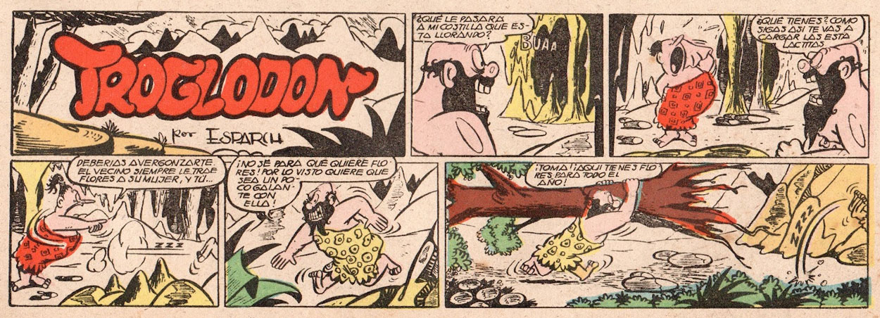 In 1956 and 1957, Juan Mas Esparch contributed to Paseo Infantil, a children's magazine published by Ediciones Generales. Among the features he worked on were 'Anastasia Cazuela' and 'Toribio', both Martz Schmidt creations starring enterprising bourgeois men and their sturdy wives. Between 1957 and 1959, the cartoonist was then present in Parque, the weekly comics supplement of the newspaper Solidaridad Nacional, with 'Pepito Pesos' (1958), a feature similar to his previous ones. Another creation for this title was 'Troglodon' (1958), about a little troglodyte character.