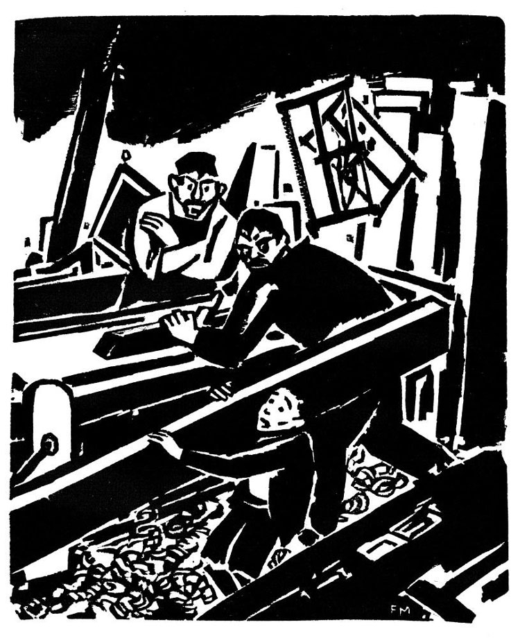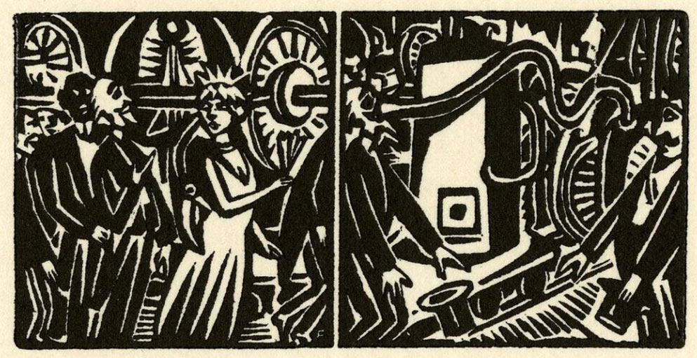 Together with Romain Rolland, Masereel envisioned a satirical film about the dangers of industrialisation, 'La Révolte des Machines où La Pensée Déchainée' ('The Machine Revolt, or the Unchained Thought'). The plot features machines rising against mankind, creating havoc and destruction. Masereel made several typeface woodcuts, intended as a storyboard, but the film never went into production. Instead, 'La Révolte des Machines' (1921) was published by Le Sablier in a limited book edition. Technically an illustrated novel, Masereel's images are sometimes presented as comic strip-like sequences. In 1923, it was also serialized in the American magazine Vanity Fair.