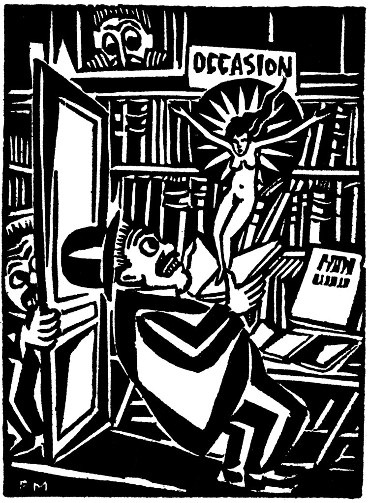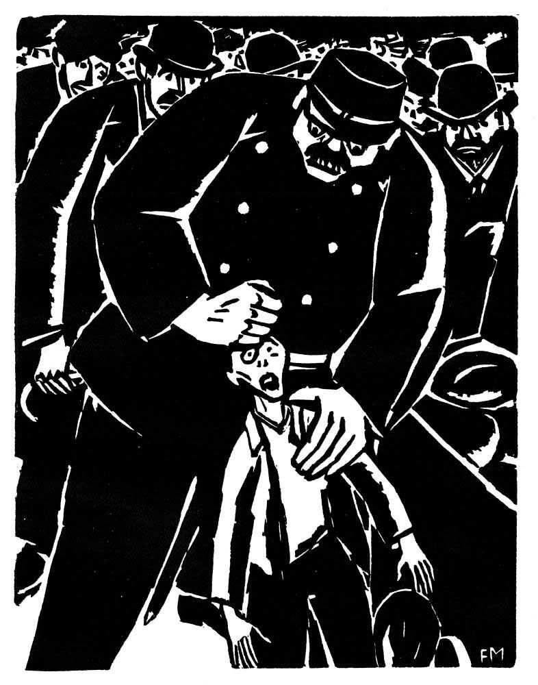 In addition to his own books, Masereel also provided a great many book illustrations, mostly for his author friends. His art decorated the pages of French authors like Charles-Louis Philippe ('Bübü vom Montparnasse', 1920), René Arcos ('Das Gemeinsame', 1920), Henri Barbusse ('Quelque Coins du Coeur', 1921), Blaise Cendrars ('Les Pâques à New York', 1926), Louis Piérard ('Ode à la France Meurtrie', 1940) and Agrippa d'Aubigné ('Jugement', 1941). He  also livened up works by German and Austrian authors, including Leonhard Frank ('Die Mutter', 1919), Andreas Latzko ('Le Dernier Homme', 1920), Carl Sternheim ('Chronik von des zwanzigsten Jahrhunderts Beginn', 1922, 'Fairfax', 1922), Stefan Zweig ('Der Zwang: Phantatische Nacht', 1929), Ernst Preczang ('Im Strom der Zeit: Gedichte', 1929) and Rudolf Hagelstange' ('Die Nacht', 1955). Masereel's illustrations were also in demand among Dutch authors like Theun De Vries ('Dolle Dinsdag', 1967) and Flemish ones like August Vermeylen ('Der ewige Jude', 1921), Maurice Maeterlinck ('Le Trésor des Humbles', 1921), Stijn Streuvels ('Kerstwake', 1928, 'De Vlaschaard', 1965), Herman Teirlinck ('De Man Zonder Lijf', 1937), Achilles Mussche ('Aan de Voet van het Belfort') and Jos Vandeloo ('Schilfers hebben Scherpe Kanten', 1974).
