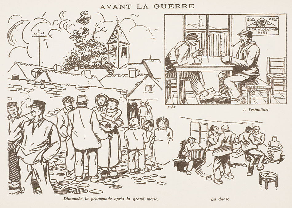 'Avant la Guerre' (from: La Grande Guerre Par Les Artistes, 1914–1916), a reflection on life before the First World War. Commoners are shown going to Mass, playing cards in a bar and dancing.