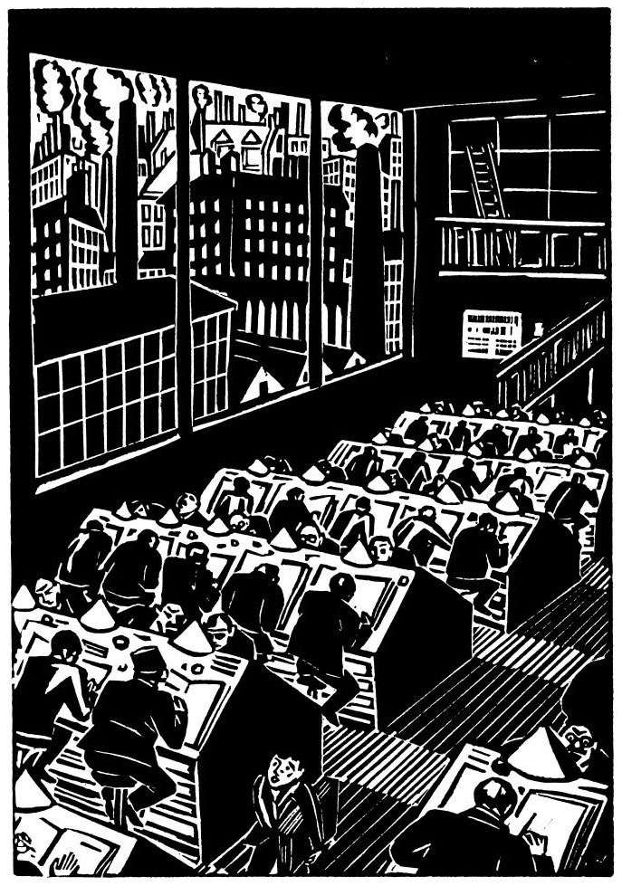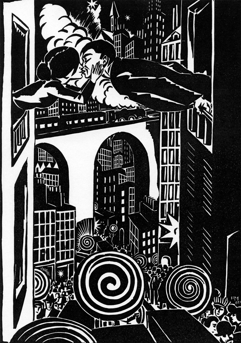 For Masereel, 'Mon Livre d'Heures' was a more personal, semi-autobiographical story. Given that he had lived in foreign cities and towns ever since leaving Belgium in the early 1910s, Masereel knew like no other how alienating and impersonal this experience could be. The book summarized all of his existential feelings. Although the work was very contemporary and based on realism, Masereel also started using exaggerated imagery and fantastical metaphors. Buildings are tilted, body parts are enlarged and backgrounds can visualize characters' emotions.