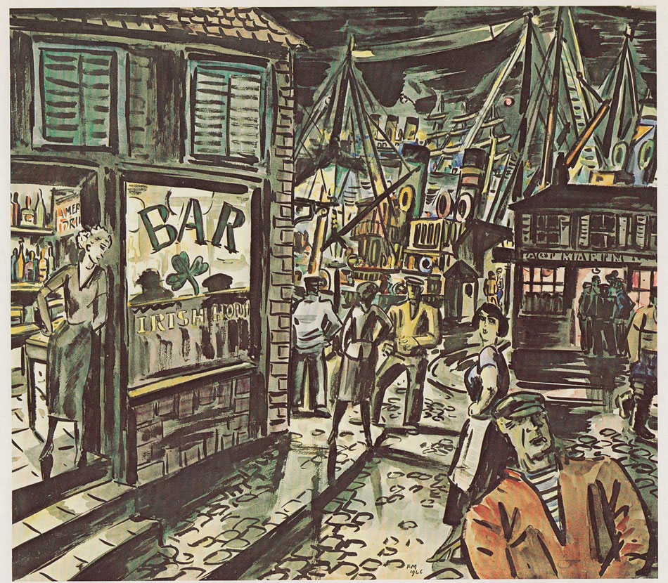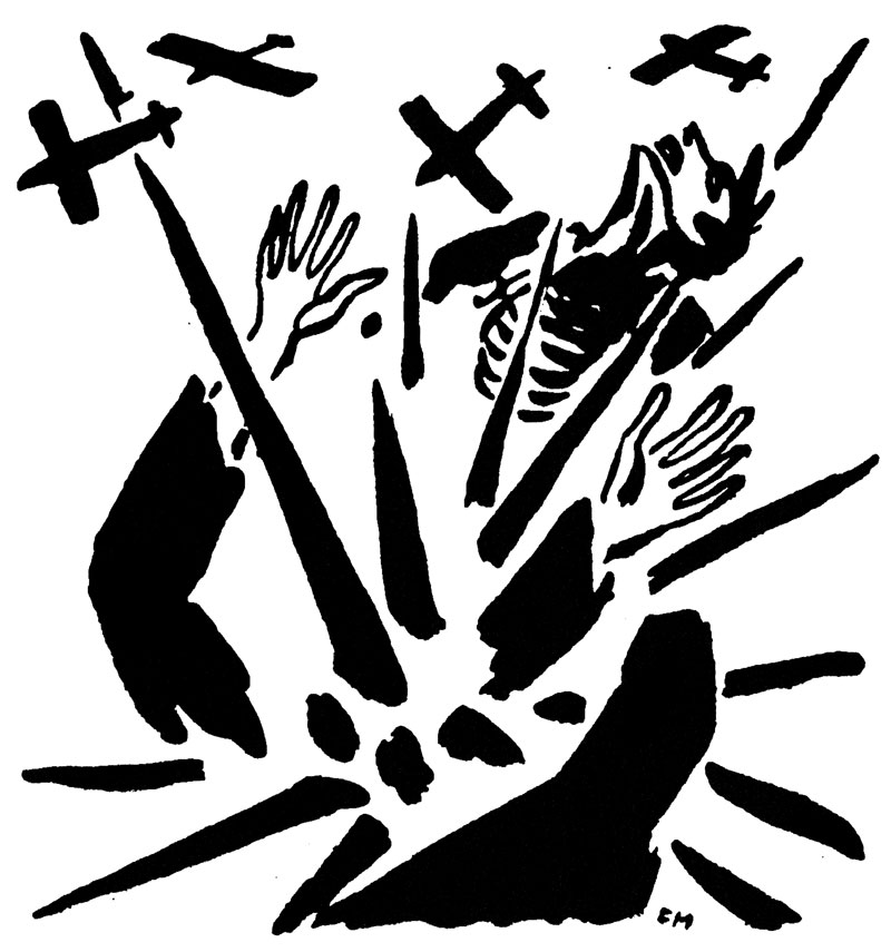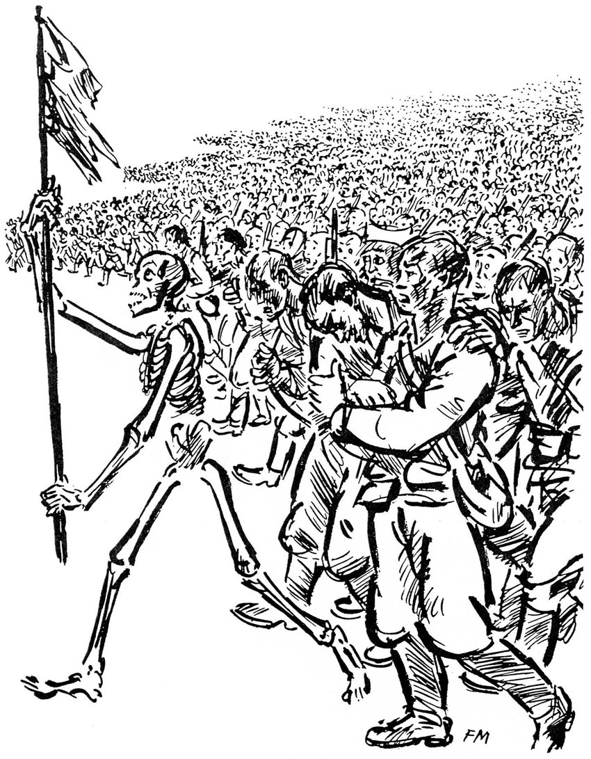 Unsurprisingly, Masereel's modernist art and pacifist, anti-fascist statements made him highly unpopular in Nazi Germany. From 1933 on, his art and books were banned, burned and exhibited during the "Entartete Kunst" ("Degenerate Art") expos, alongside other modern and experimental artists. When Hitler invaded Paris in 1940, Masereel again fled on foot, walking all the way to Orléans. A wise decision in retrospect, since his studio in Équihen was plundered and many of his works destroyed. In 1941, he settled in Avignon, where he had an affair with a fellow painter named Laure Malclès. During this period, he made several anti-Nazi pamphlets, drawings and engravings for the French Resistance, among them 'Juin 1940' (1942). The Resistance expressed their gratitude by making a false passport for him, allowing him to move to Lot-et-Garonne under the identity of "Françóis Adolphe Laurent", where he spent the remainder of the war.