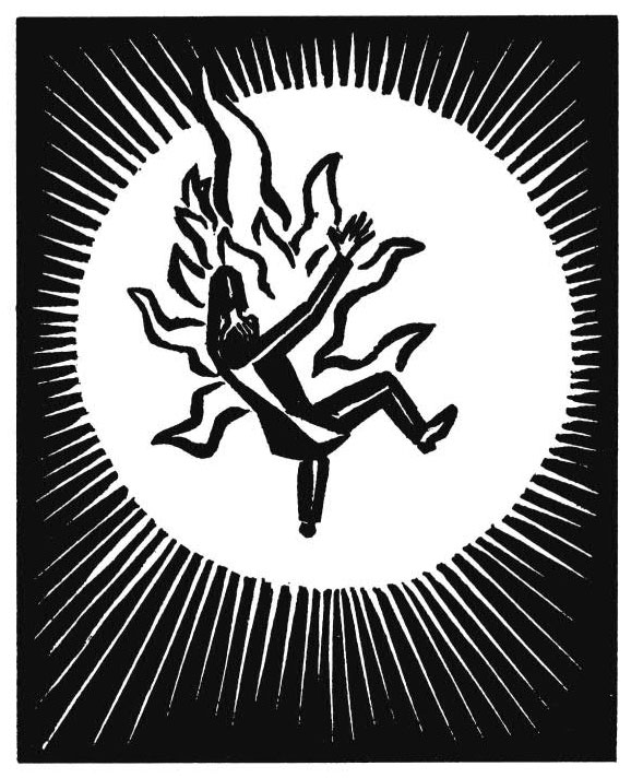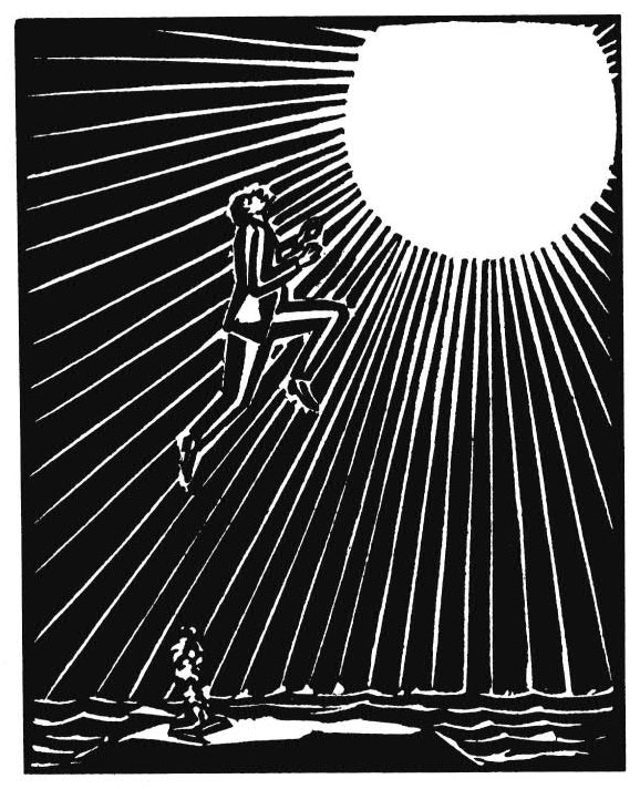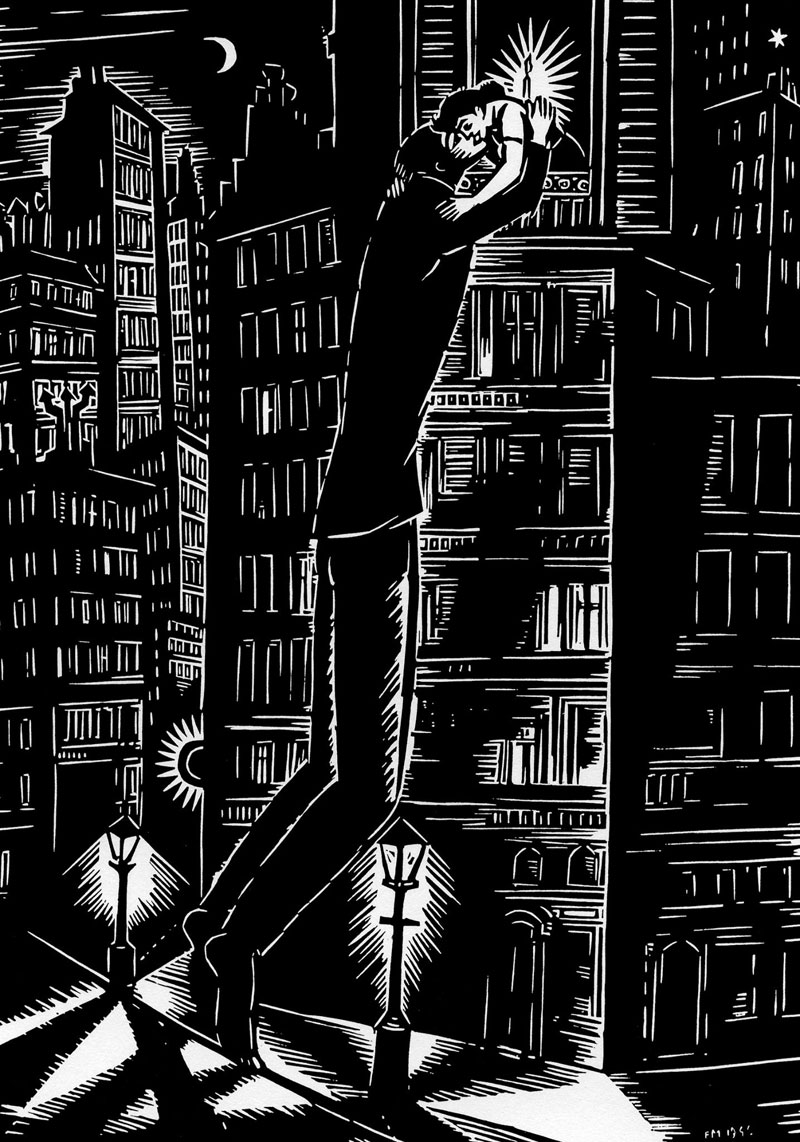 With 'Le Soleil' ('The Sun', 1919), Masereel made a 63-woodcut metafictional story. It starts off with an artist falling asleep behind his desk. As he slumbers, a tiny man crawls out of his head and wanders off into the world. People try to discourage and distract him, but his aspirations drive him away from this peer pressure. Instead, he climbs on the highest possible trees, buildings and objects, trying to reach the Sun. Much like the Greek mythological character Icarus, the tiny man nearly burns himself and plummets back to Earth. At that precise moment, the artist wakes up, scratching his head in bewilderment.