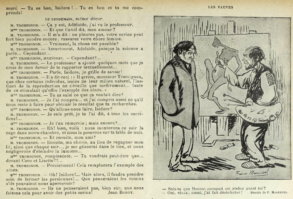 Artwork by Frans Masereel in Le Rire (1913).Translation: "Did you know that Bonnat lived in this studio before you?" - "Yes, old man, that's why I've had it disinfected!".